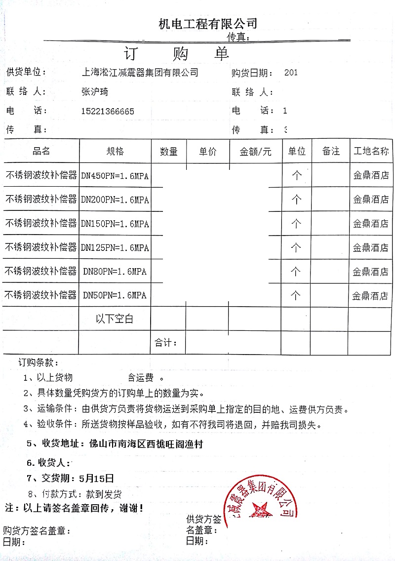上海淞江減震器集團有限公司為您介紹:佛山金鼎酒店不銹鋼波紋補償器項目合同信息,淞江集團銷售在2018年5月18日簽下該合同,為佛山金鼎酒店項目提供不銹鋼波紋補償器產品,以下是詳細介紹。