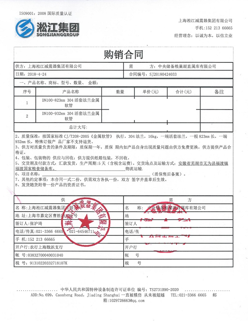上海淞江減震器集團有限公司為您介紹:中央儲備糧巢湖直屬庫金屬軟管合同信息,淞江集團銷售在2018年4月26日簽下該合同,為儲備糧巢湖直屬庫提供金屬軟管產品,口徑為DN100-823mm,DN100-932mm,以下是詳細介紹。