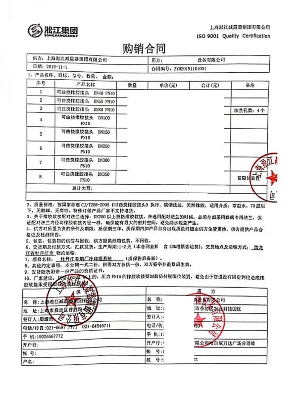 上海淞江減震器集團有限公司介紹:牡丹江卷煙廠冷卻塔系統橡膠軟連接合同信息,淞江集團為眾多卷煙廠冷卻塔系統配套橡膠接頭,起到減震和降噪的作用。
