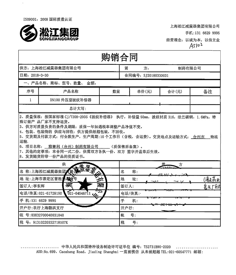 上海淞江減震器集團有限公司為您介紹:雅賽利(臺州)制藥有限公司波紋補償器購銷合同信息,淞江集團銷售在2018年4月3日簽下雅賽利制藥有限公司的合同,為該項目提供波紋補償器產品。