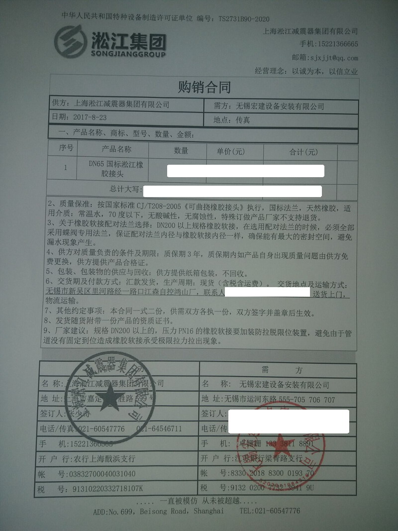 上海淞江減震器集團有限公司為您介紹:無錫江森自控鴻山廠橡膠軟接頭合同案例信息,淞江集團銷售在2017年8月23日簽下該合同,為無錫江森自控鴻山廠提供DN65國標淞江橡膠軟接頭產品。
