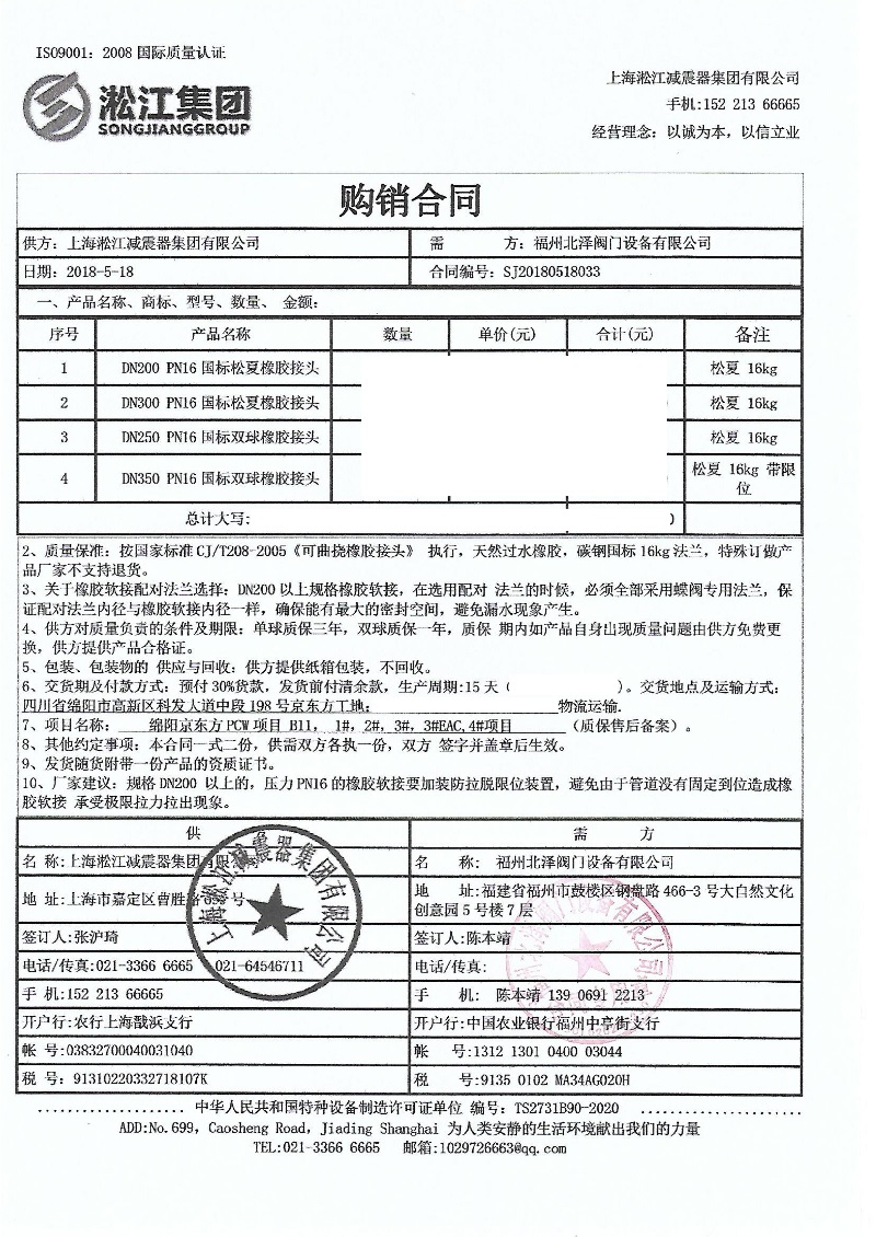 上海淞江減震器集團有限公司為您介紹:綿陽京東方雙球橡膠接頭合同案例信息,淞江集團銷售在2018年5月18日簽下該合同,為綿陽京東方項目提供橡膠軟接頭產品,以下是詳細介紹。